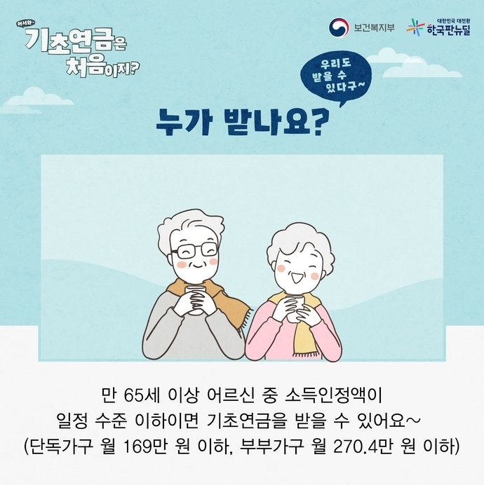 기초연금은 만 65세 이상이고 대한민국 국적을 가지고 계시며 국내에 거주(「주민등록법」제6조 1, 2호에 따른 주민등록자)하는 어르신 중 가구의 소득인정액이 선정기준액 이하인 분들께 드립니다. * 부부 중 한 분만 신청하시는 경우도 부부가구에 해당합니다.