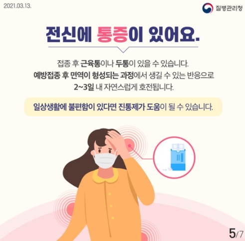 접종 후 근육통이나 두통이 있을 수 있습니다. 예방접종 후 면역이 형성되는 과정에서 생길 수 있는 반응으로 2~3일 내 자연스럽게 호전됩니다. 일상생활에 불편함이 있다면 진통제가 도움이 될 수 있습니다.
