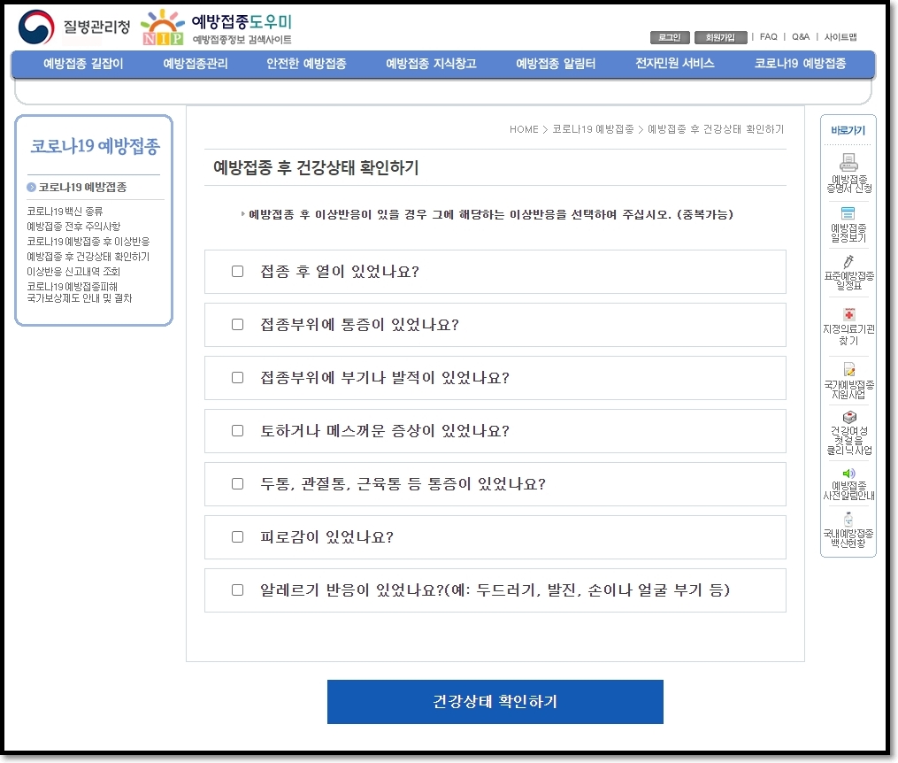 예방접종 도우미 > 코로나19 예방접종 > 예방접종 후 건강상태 확인하기