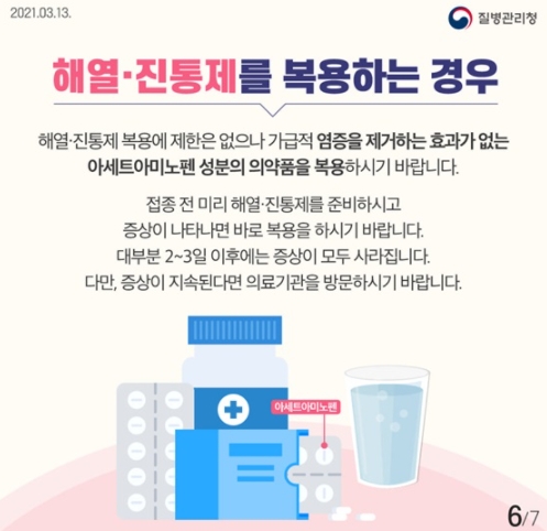 해열·진통제 복용에 제한은 없으나 가급적 염증을 제거하는 효과가 없는 아세트아미노펜 성분의 의약품을 복용하시기 바랍니다. 접종 전 미리 해열·진통제를 준비하시고 증상이 나타나면 바로 복용을 하시기 바랍니다. 대부분 2~3일 이후에는 증상이 모두 사라집니다. 다만, 증상이 지속된다면 의료기관을 방문하시기 바랍니다.