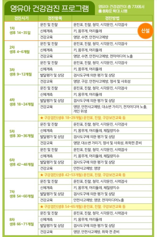 이렇게 해서 영유아 초기 건강검진 신청방법과 혜택 대상 등에 대해 알아보았습니다. 기존에는 7차에 걸쳐서 했던 프로그램인데 이번에 초기 건강검진이 추가되면서 총 8차로 확대된 프로그램입니다. 아직 많은분들에 모르실듯해서 소개해 드렸습니다. 아기가 태어나자마자 건강검진 꼭 받아서 혜택을 누리시기 바랍니다~ ^^ 이상으로 오늘 포스팅은 마치도록 하겠습니다. 모두 즐거운 하루 되세요~ ^^