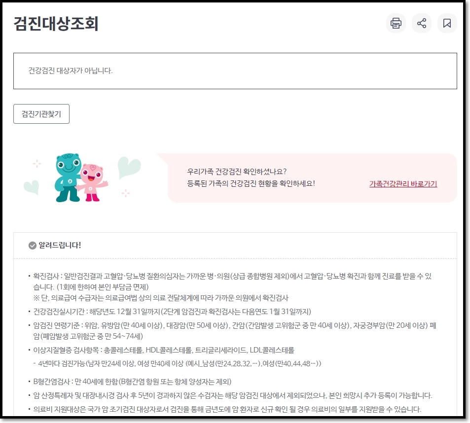 이번 연도는 대상자가 아니라고 뜹니다~ ^^ 만약 해당된다면 알려주겠죠~ 이번 연도에 건강검진을 해야 하나 안 해야 하나 헷갈리신다면 알려주신방법으로 쉽게 확인하실 수가 있을 겁니다.