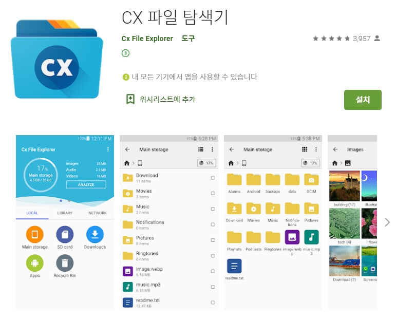 네 번째 소개할 어플은 CX 파일 탐색기 어플입니다. 아래는 CX 파일 탐색기 어플에 대한 자세한 설명이니 참고하세요~