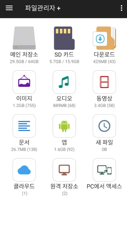 • 다운로드: 다운로드 폴더에 있는 모든 파일(apk와 zip파일 포함)을 관리할 수 있습니다.