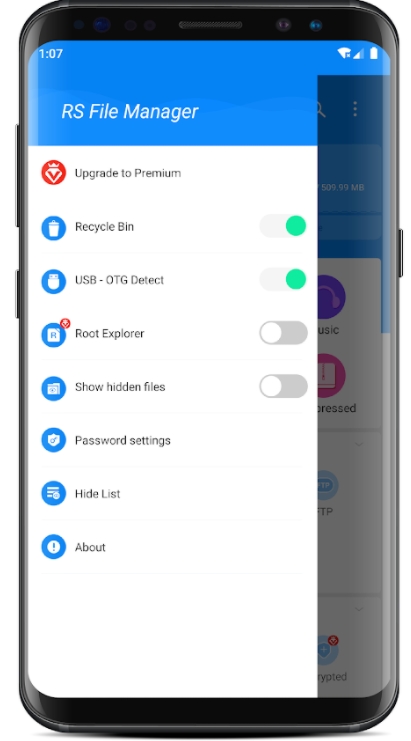 RS 파일 관리자는 파일 복사, 잘라 내기, 삭제 및 이름 바꾸기를 포함한 다양한 기본 파일 작업을 제공합니다. 파일 숨기기, 파일 책갈피, 파일 공유, 파일 압축, 파일 압축 해제 등도 제공됩니다.