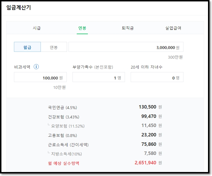▲ 저는 월급을 3백만원 그리고 부양가족은 1명 자녀수는 0명 으로 입력하니 실수령액이 2,651,940 원으로 나오네요~ 국민연금과 건강보험 고용보험 요양보험 근로소득세 지방소득세 내역까지 자세하게 바로 나옵니다. 보다 자세하게 확인하고 싶다면 이렇게 네이버에서 확인하실수가 있답니다~