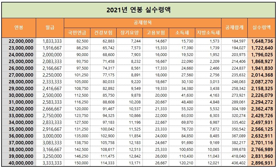 2. 2021 월급 실수령액 / 연봉 실수령액 표