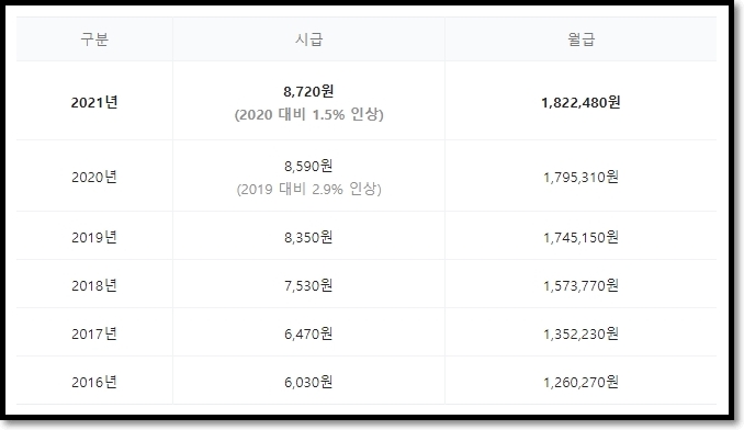 역대 년도별 최저임금과 월급은 아래 표를 참고하세요~