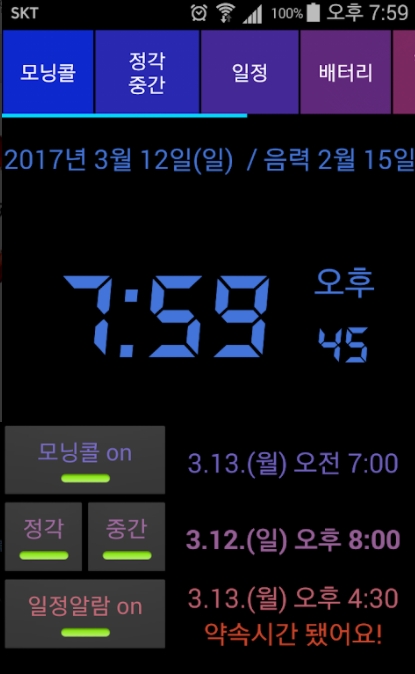 ▶ 시간관념이 없었는데... 도움이 많이 됩니다. 단. 시간 목소리와 날짜 목소리를 통일시켜 주시면 더욱 좋겠습니다. 잘 쓰고 있습니다.