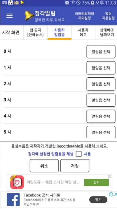 - 정각 알림음 대신 시간별 사용자 설정 알림음 사용