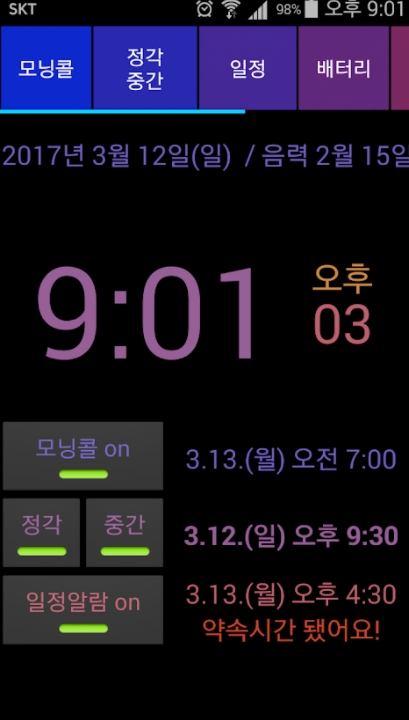 3. 홈 위젯에 현재 날짜와 시간, 음력, 다음 알림 시간 표시