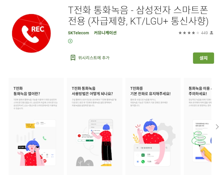 두 번째 소개할 어플은 T전화 통화녹음(삼성폰 전용) 어플입니다. 무료 이며 아이폰유저는 사용하실수가 없습니다. 아래는 T전화 통화녹음(삼성폰 전용) 어플에 대한 자세한 설명이니 참고하세요~