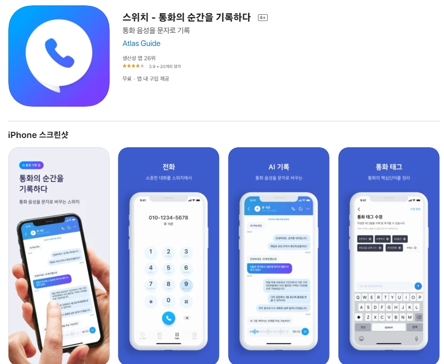 스위치 어플을 이용하시면 아이폰에서 통화 녹음이 가능합니다. 더불어 스위치 앱에서 통화를 하게 되면 음성을 문자로 남길 수 있답니다. 통화가 끝났을 때, 녹음된 음성이 자동으로 텍스트로 변환됩니다. 이는 아틀라스 랩스에서 자체적으로 개발한 AI 기술을 이용한 건데요 아이폰 유저들이 많은 불편함을 겪고 있었던 통화 중 자동녹음 방법을 이 스위치 어플이 해결을 하고야 말았습니다. 스위치 어플 소개는 아래를 참고하세요~
