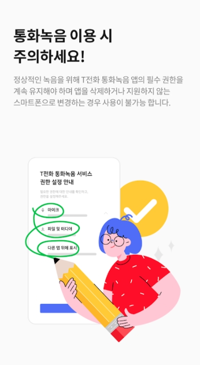 ▶ 이 앱 계속 유지해주세요. 진짜 티 전화와 함께 필수 앱입니다 정말 감사합니다. 그리고 안 되는 분들 설정 가서 이 앱에 백그라운드에서 실행 허용, 이앱에 배터리 절전 사용 안 함 꼭 설정하세요. 안 그러면 녹음 대기 중만 뜨고 녹음 안됩니다.