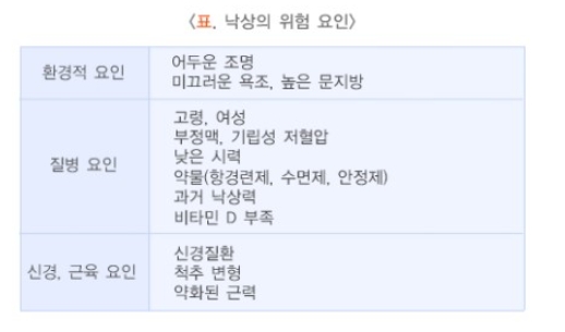 골절의 발생 기전에서 나타난 것처럼 낙상은 골절 발생의 중요한 요인입니다. 낙상의 위험 요소로 알려진 것은 아래의 표와 같습니다..