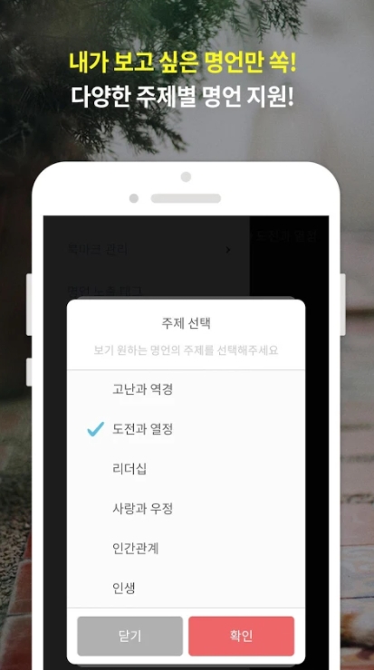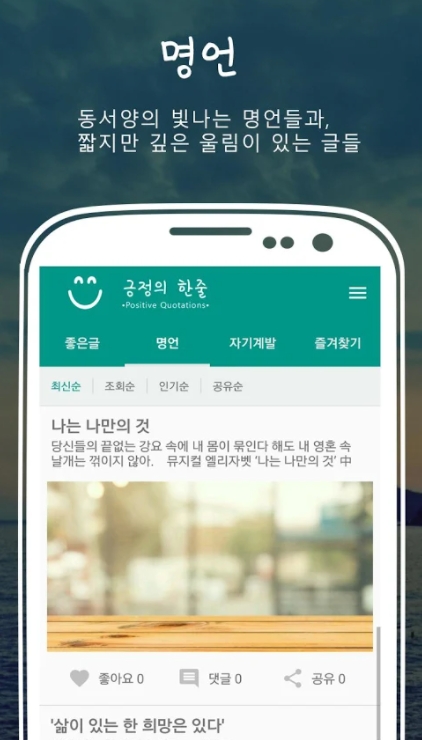 아픔과 시련을 극복하고 좋은 글귀와 긍정의 글로 마음의 상처를 치유하는 샘터 같은 '명언 어플'이 되겠습니다!