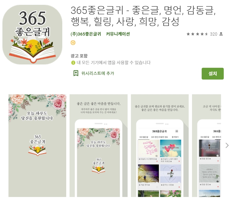첫 번째 소개할 어플은 365 좋은 글귀 어플입니다. 아래는 365좋은글귀 어플에 대한 자세한 설명이니 참고하세요~