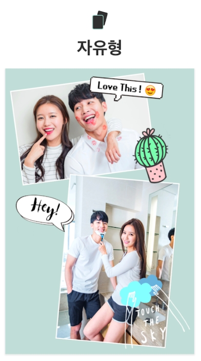 고정 템플릿 프레임이 마음에 들지 않는다면 프리 스타일을 사용해 보세요. 사진의 위치와 콜라주 재료 배치를 마음대로 결정하세요.