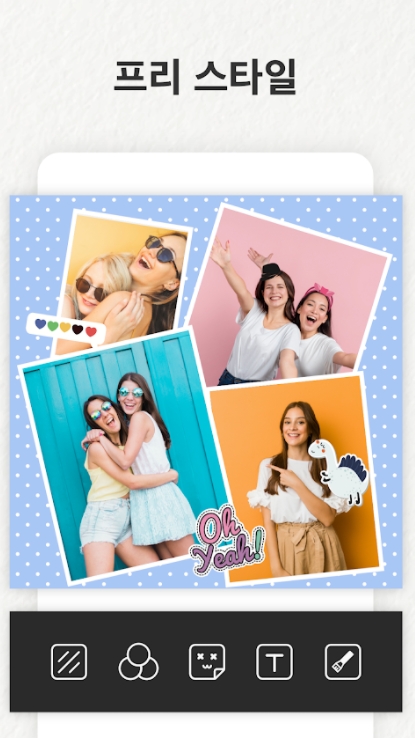좋아하는 이미지를 선택하기만 하면 쉽게 완벽한 레이아웃에 넣을 수 있고, 다양한 스타일의 배경, 텍스트, 스티커 및 프레임을 추가해 사진을 예술로 바꿔 나만의 독특하고 멋진 콜라주를 만들 수 있습니다.