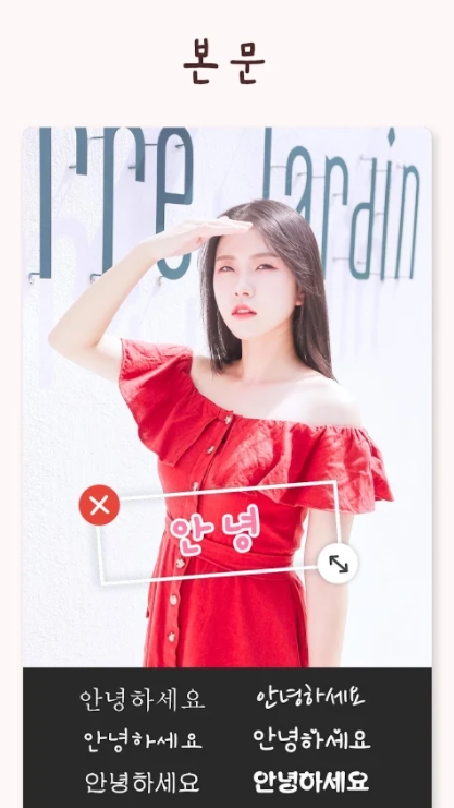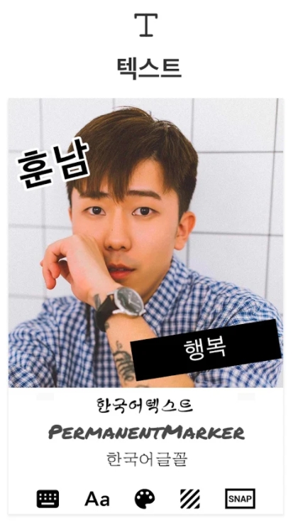 Add text / 문자 추가: 다양한 폰트、글자색、배경색을 선택하기. 인터넷에서 다른 폰트를 다운로드도 돼요.