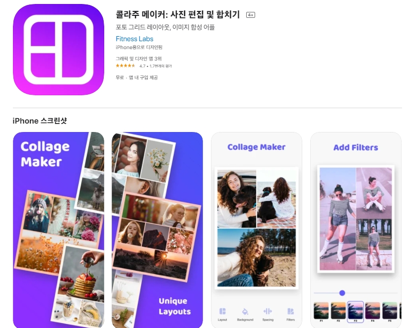 네 번째 소개할 어플은 콜라주 메이커(사진 편집 및 합치기) 어플입니다. 이 어플은 아이폰 사용자도 사용하실 수 있는 어플입니다. 아래는 콜라주 메이커(사진 편집 및 합치기) 어플에 대한 자세한 설명이니 참고하세요~