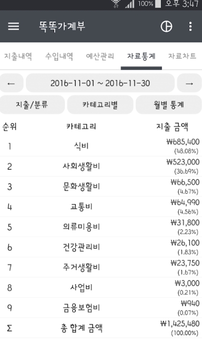 - 자산, 카테고리, 금액별로 나눠서 통계를 확인할 수 있습니다.