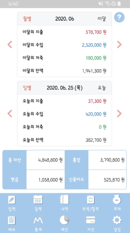 - 현금, 통장, 체크카드, 신용카드로 나눠서 자산을 관리할 수 있습니다.