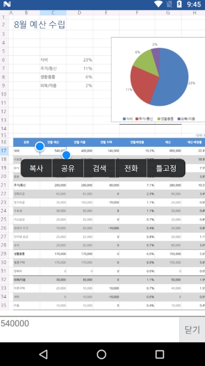 스프레드 시트 : 예산, 경비 보고서 등을 검토하고 편집합니다.